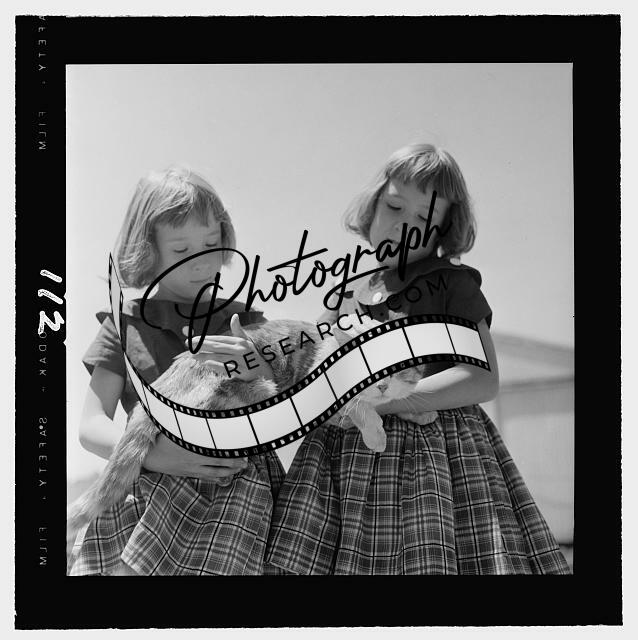 Iowa farm girls,dressed identically,holding cat,country life,animals,IA,1958