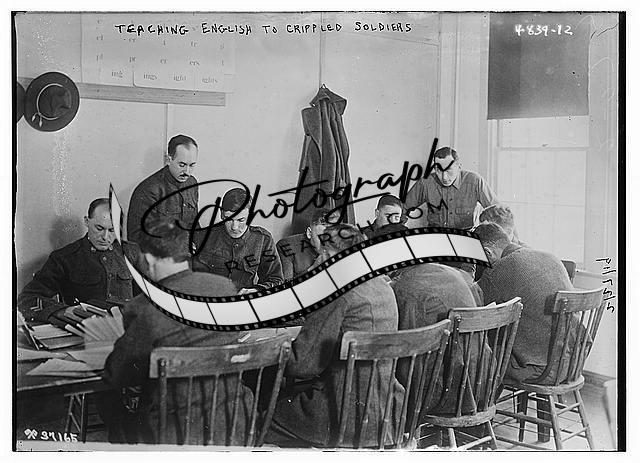 Teaching English,crippled soldiers,troops,chair,Bain News Service