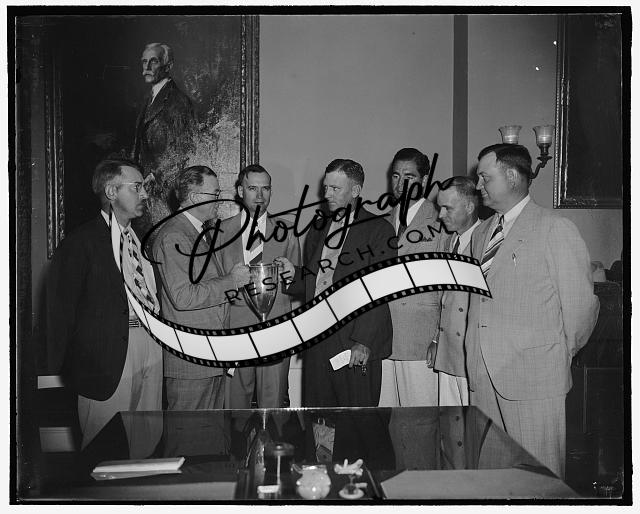 John W. Hanes presents Morgenthau cup,winner of Treasury rifle match,1939