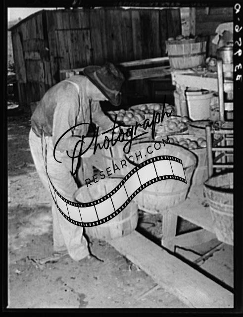 Title: Man putting baskets of fruit on a porch. Muskogee, Oklahoma