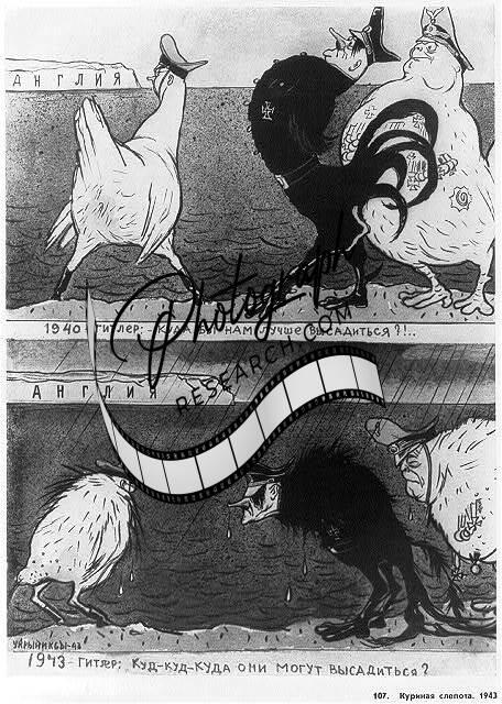 Russian cartoon showing Hitler, Goering and Himmler as strutting cocks looking across Channel to England, saying "Where shall we land? - 1940" and again in 1943 saying, "where will they land?"