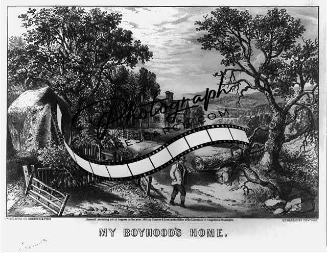 My boyhood's home 1,Currier & Ives,c1872,house,man,trees
