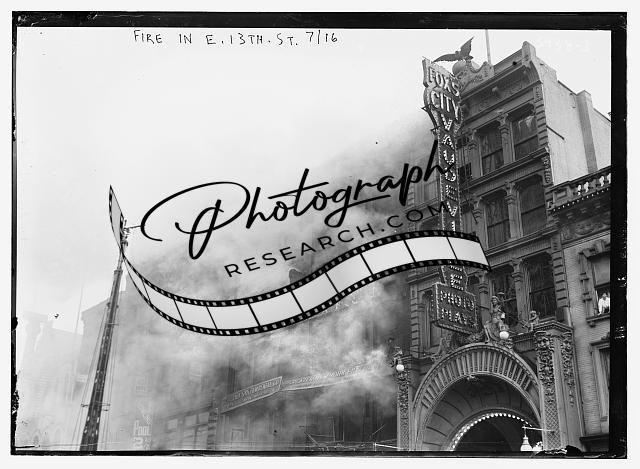 Fire,E. 13th Street,July 1916,smoke,Fox's City Vaudeville sign,building,Bain