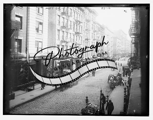 Mott Street,New York,NY,pedestrians,horse-drawn carriage,buildings