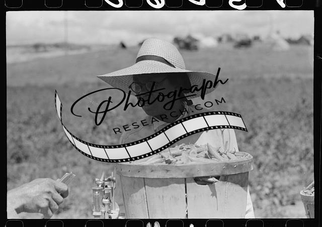 Title: Pea pickers bring in hampers of peas. Nampa, Idaho.
