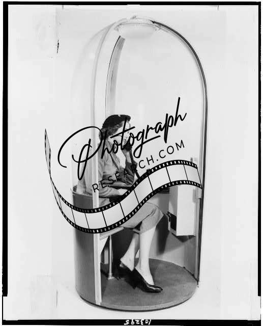 Future calling,telephone booths,forecasting,modern,woman,glass,bench,1958