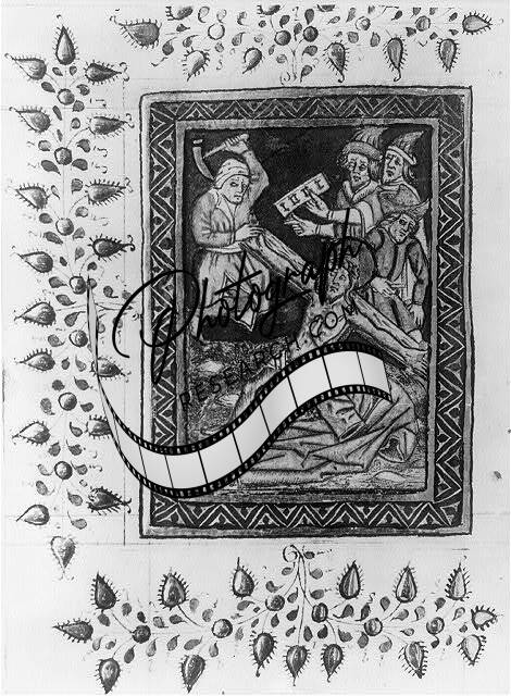 Nailing Jesus to cross,Huth Manuscript,British Museum