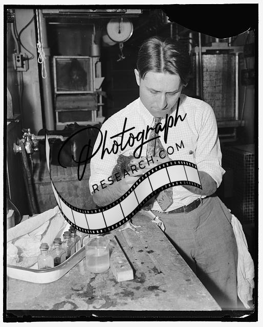 Title: Easter bunnies' laurels threatened. Government experts enable hens to color own eggs. Washington, D.C., April 7. An interesting experiment is in progress at the National Agricultural Center, Beltsville, Maryland, whereby hens color their own eggs over a range of hues from a pearly white through brown to sky-blue. This picture of Charles A. Denton, Junior Chemist, at the nutrition laboratory, shows the method of measuring the yolk index. Eventually we may anticipate a uniformity of eggs in shape and in yolk color as well as a definite amount of proteins contained in each one. 4.7.39