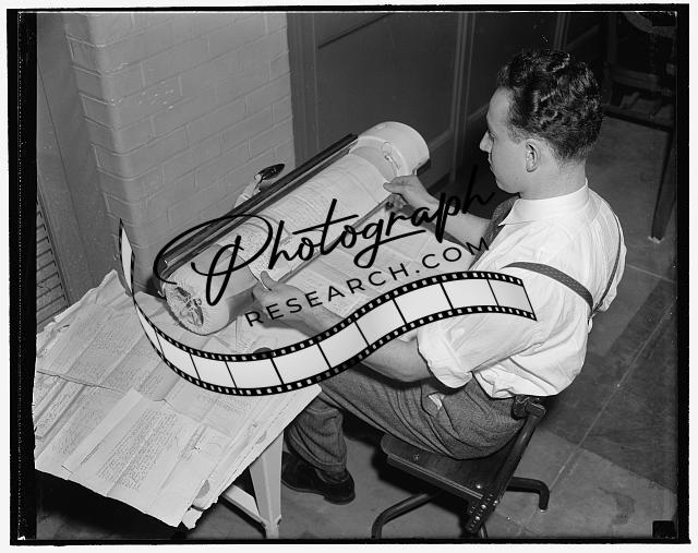 Title: National Archives. Washington, D.C., Nov. 22. In the powerful press, the sheets of acetate, under heat and pressure 'melt' into the pores of the paper and adhere to each other as well. One additional advantage of this process is that, after being pressed with the sheets of cellulose acetate, the paper is thinner and takes up less room than it did originally. The result is a sheet of paper and acetate which comes off the polished metal plates as a single sheet. Tests for the aging of this material made by the Bureau of Standards in Washington have shown that this treatment of the paper, called laminating is as permanent as it is possible to make any record of paper