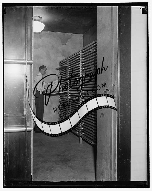 Title: National Archives. Washington, D.C., Nov. 22. The documents between two highly polished metal plates and sandwiched between two sheets of cellulose acetate is placed in the hydraulic press