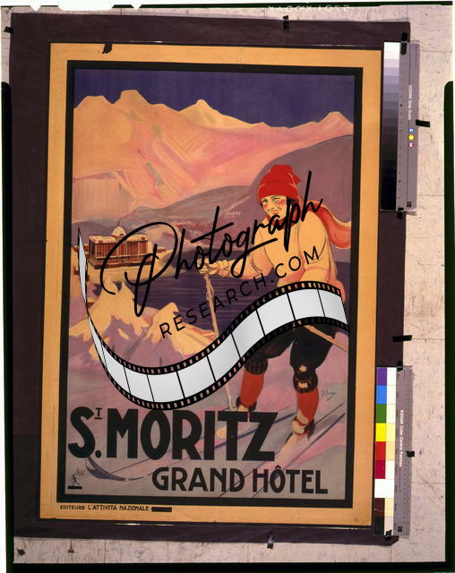 St. Moritz Grand Hotel,Skier in Mountains,Hotel,Lake Shore,Switzerland,1920