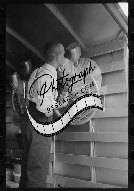 Title: Members of Southwestern University band unloading instruments from truck, National Rice Festival, Crowley, Louisiana