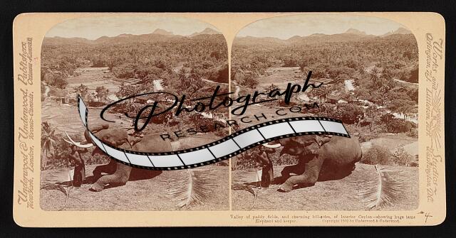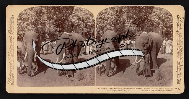 Tame elephants, the mammoth beasts of labor and travel, in tropical Ceylon--near