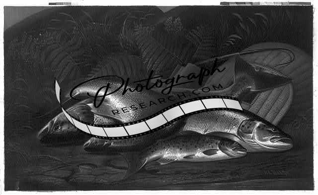 Salmon,trout beside fishing gaff,creel,H.L. Rolfe