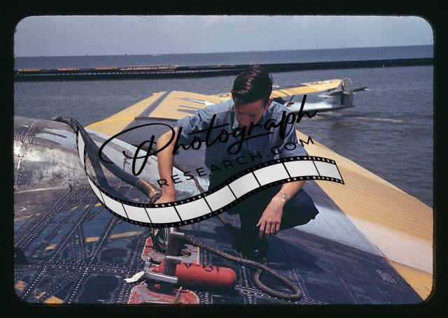 Title: This sailor mechanic is inspecting a PBY plane at the Naval Air Base in Corpus Christi, Texas. The ship had been reconditioned by the Civil Service employees at the Assembly and Repair Department in the base