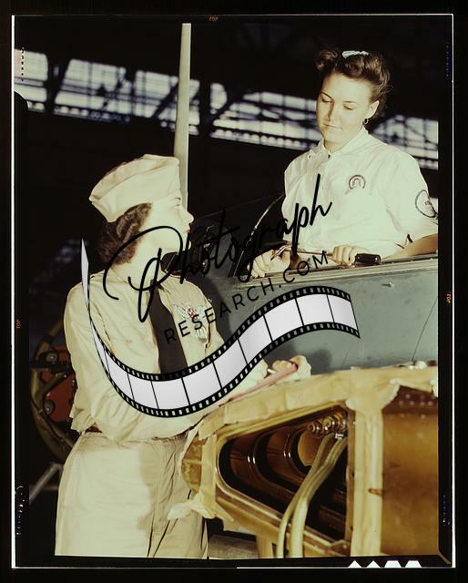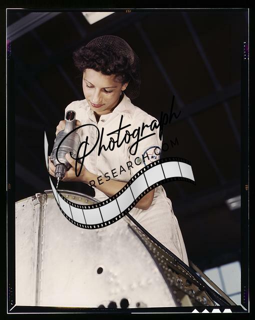 Title: Oyida Peaks riveting as part of her NYA training to become a mechanic in the Assembly and Repair Department at the Naval Air Base, Corpus Christi, Texas