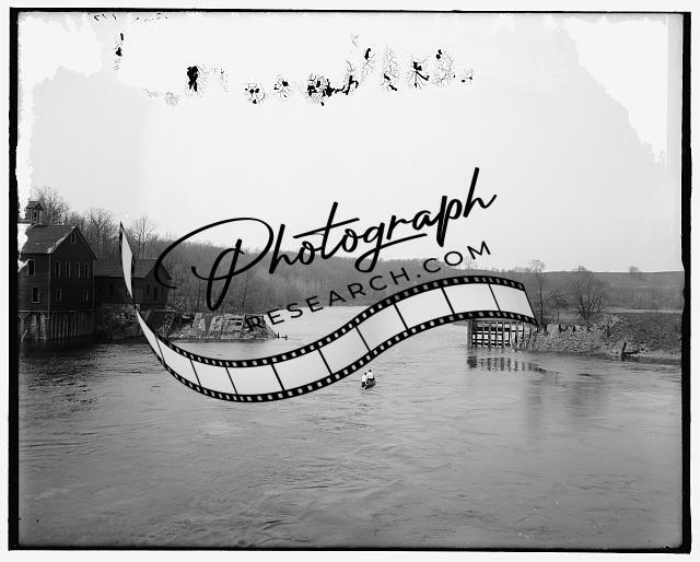 Broken dam,Huron River,buildings,canoes,water travel,Ann Arbor,Michigan,MI,1900