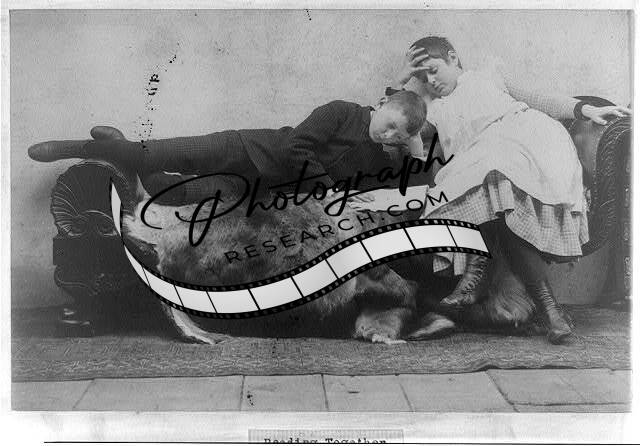 Reading together,c1887?,girl seated,boy lying,reading on sofa,children