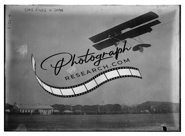Charles Niles in Japan,airplane,aviation,in flight,buildings,Bain News Service