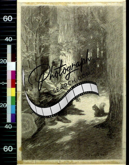 Lunch hour!,1911?,Robert Emmett Owen,Forest,Man,Squirrel,Woods,Animals
