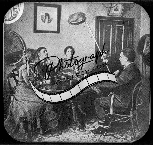 Seance,five people,table,looking upward,holding guitar,tambourine,pole,c1926