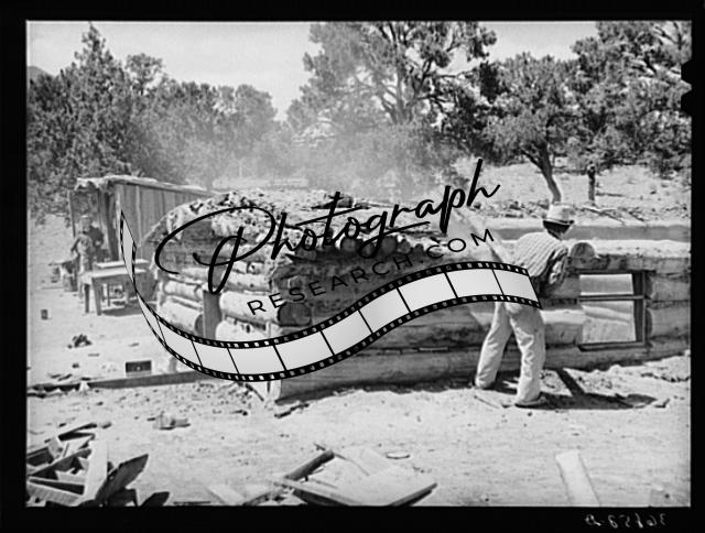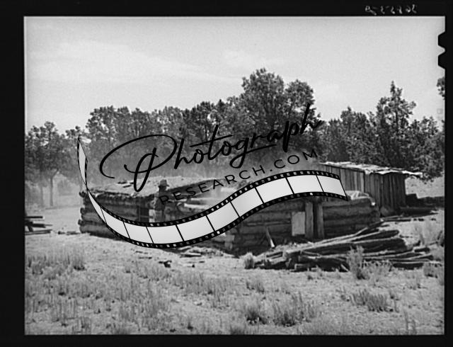 Title: Log house built by a homesteader. This homesteader, who was deeded his farm four years ago, is now sick and lives in town, renting his house and farm to a young couple. Pie Town, New Mexico