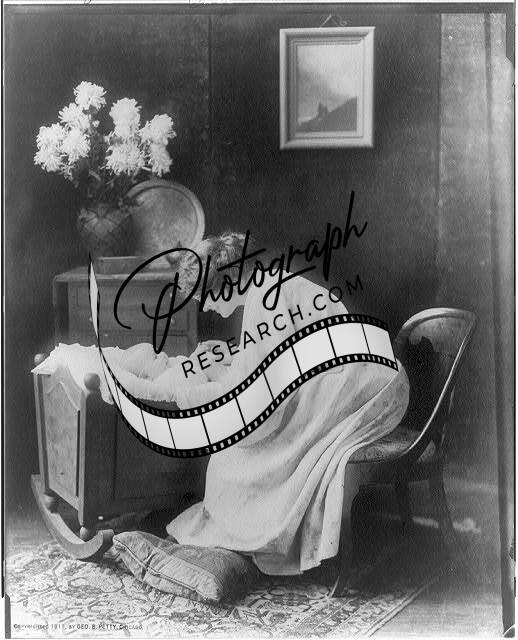 Summary: Photograph shows mother with little girl standing over cradle looking at sleeping baby.