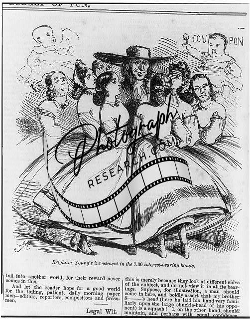 Brigham Young's investment,Caricature,Mormon polygamy,adoring wives,1865
