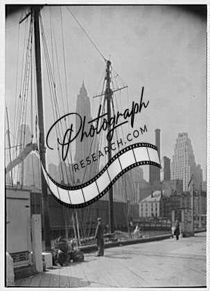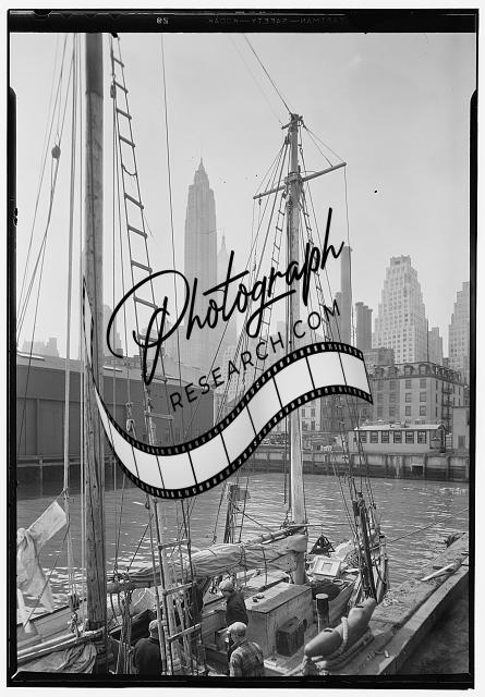 New York city views. Fishing boat,city at Fulton Market Pier,Samuel Gottscho,1