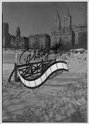 New York city views. Bridge foreground,Central Park West,over frozen lake,1933
