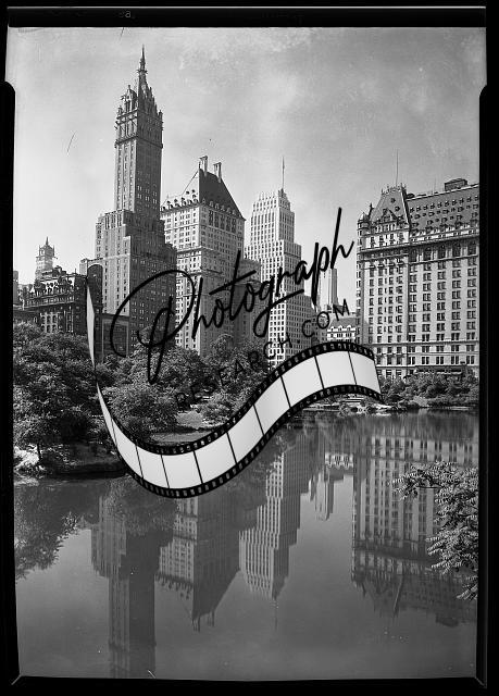 New York city views. Plaza buildings,reflected in open lake,Samuel Gottscho,1933