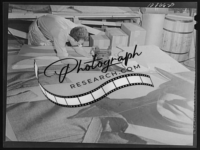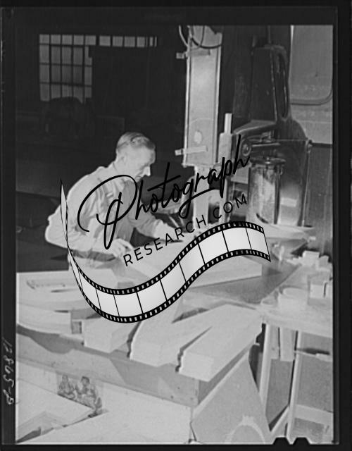 Title: New York, New York. Preparing the defense bond sales photomural, designed by the Farm Security Administration, to be installed in the Grand Central terminal, in the shop of a contractor. Cutting out plywood letters used for the text