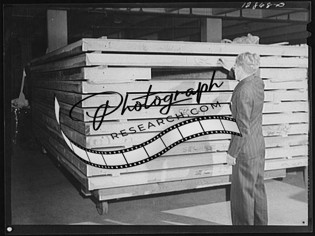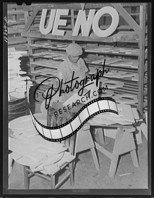 Title: New York, New York. Preparing the defense bond sales photomural, designed by the Farm Security Administration, to be installed in the Grand Central terminal, in the shop of a contractor. Cutting out part of a large figure mounted on homosote board with a routing machine