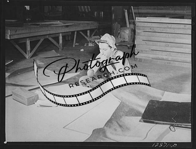 Title: New York, New York. Preparing the defense bond sales photomural, designed by the Farm Security Administration, to be installed in the Grand Central terminal, in the shop of a contractor. Sections of one panel ready for installation