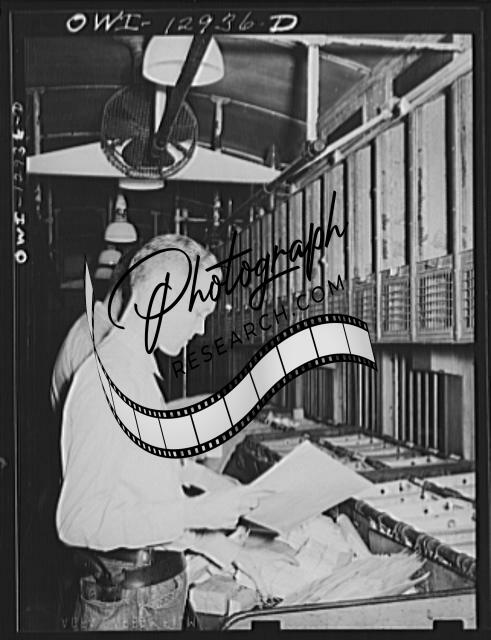 Handling mail on board a mail car,1938,Farm Security Administration,FSA