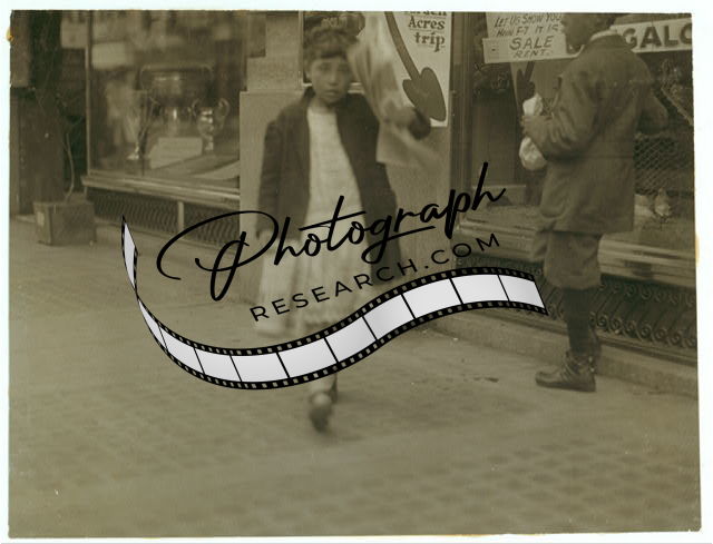 Title: Newsgirl about 11 years old, with a single paper making a begging and sight seeing trip through the business section. See California report. Location: Los Angeles, California / Lewis W. Hine.