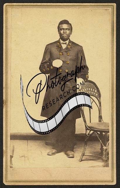 Summary: Photograph shows three-quarter length portrait of an African American? man in uniform, sitting, holding a trumpet, facing front.