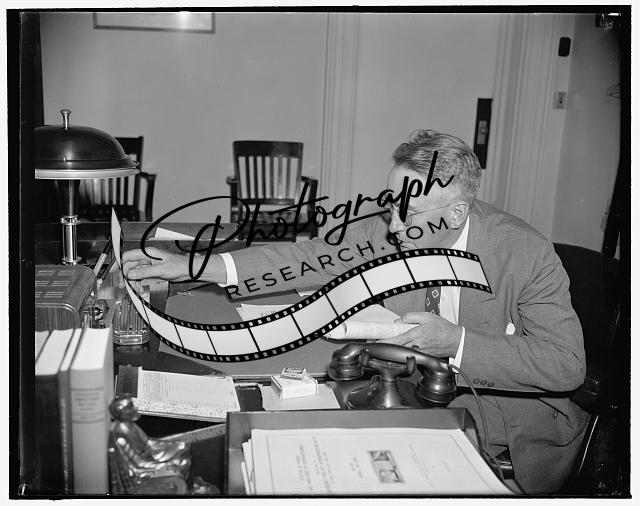 Title: Manufacturers group asks removal of taxes to stimulate recovery of business. Washington, D.C., June 3. Noel Sargent of New York, representing the National Association of Manufacturers, presented an 8 point program of tax revision to the House Ways and Means Committee today. The association asked the removal of the undistributed profits, capital stock, and excess profits taxes to put private enterprise into a movement to stimulate recovery. He presented the program as the association's answer to Treasury Secretary Morgenthau's statement that 'the basic need today is to foster the full application of the driving force of private capital.' Left to right: John Hanes, Undersecretary of the Treasury, who attended the committee meeting, and Sargent