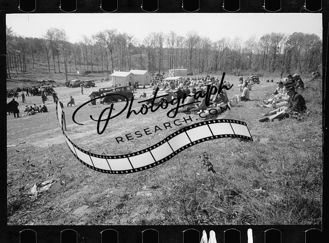 Noon day call,crowds,transient workers,automobiles,Greenbelt,Maryland,MD,1935 2