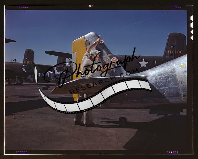 Title: A young woman employee of North American Aviation, Incorporated, working over the landing gear mechanism of a P-51 fighter plane, Inglewood, Calif. The mechanism resembles a small cannon