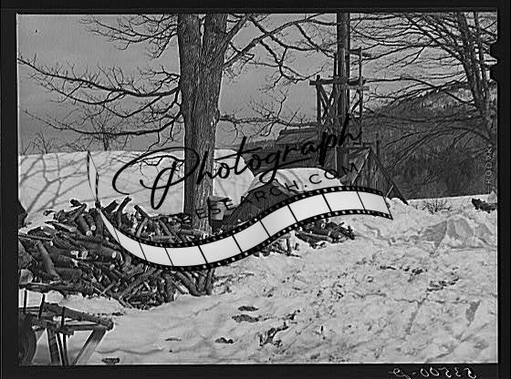 Title: Bringing in maple sap to the sugar house. Frank H. Shurtleff farm, North Bridgewater, Vermont. He has a 400 acre farm originally purchased by his grandfather in 1840. He raises sheep, cows, cuts lumber. He has been making maple syrup for about thirty five years, and 'sugaring' usually brings in about one thousand dollars annually. Because of the deep snow, this year he only tapped 1000 trees, instead of 2000. He expects to make about 300 to 500 gallons this year