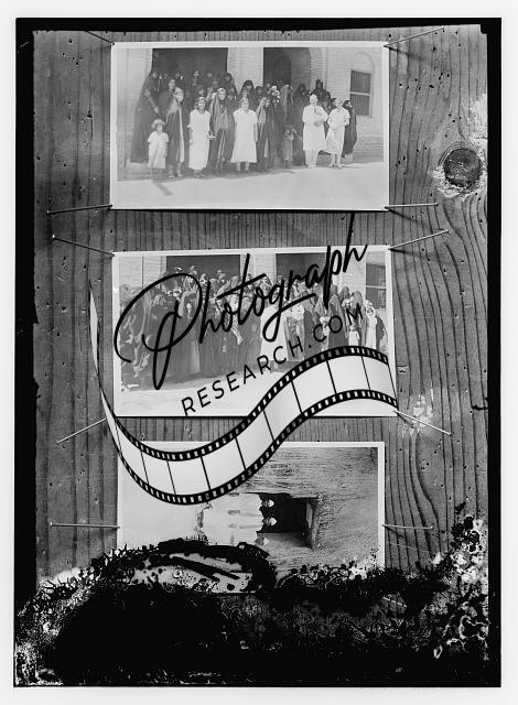 Title: [Copy of photographs showing: boys' sports team (upper left); group portrait of men, women, and children (upper right); group portrait of young men gathered around man with camera (bottom left); landscape (bottom center); and boys and men in classroom (bottom right)]