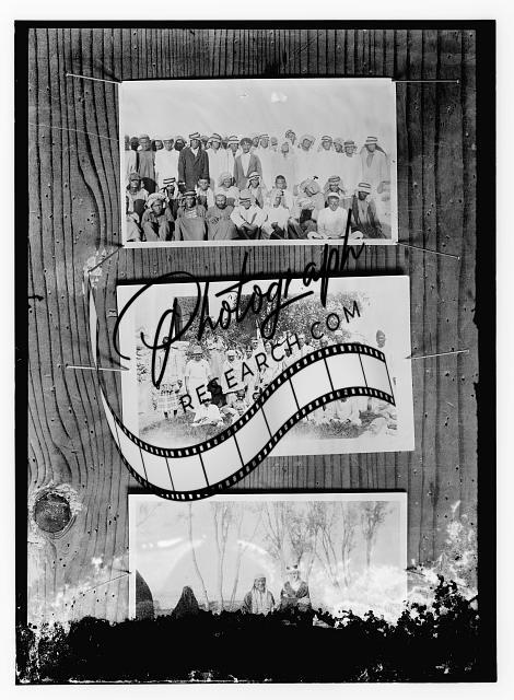 Title: [Copy of photographs showing: portrait of Arab man (top); and group of Arab men, women, and children gathered around a man wearing a pith helmet (bottom)]