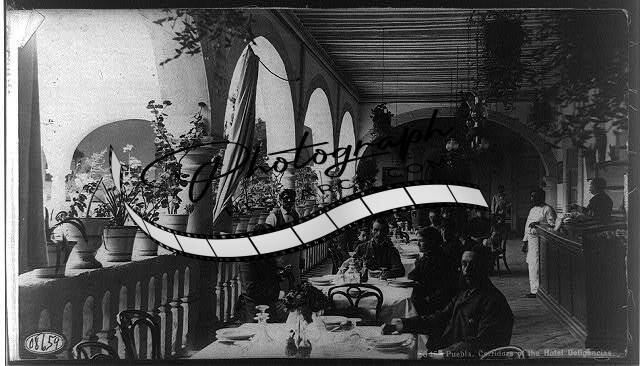 Puebla,corridors of Hotel Deligencias,c1884,people dining on balcony of hotel