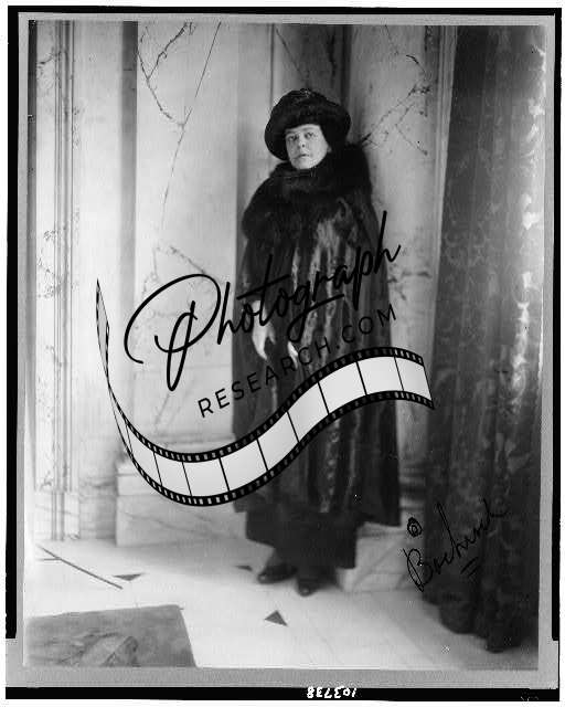 Alva E Belmont,leaning,column,dressed,cape,fur neckpiece,hat,clothing,c1919