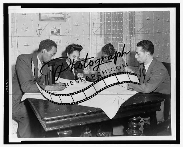 Daniel Lomax signing affidavit, Beatrice M. Reed, N.A.A.C.P., Polly Johnson sign; Austin L. Fickling, NAACP lawyer, looks on while smoking a cigar.