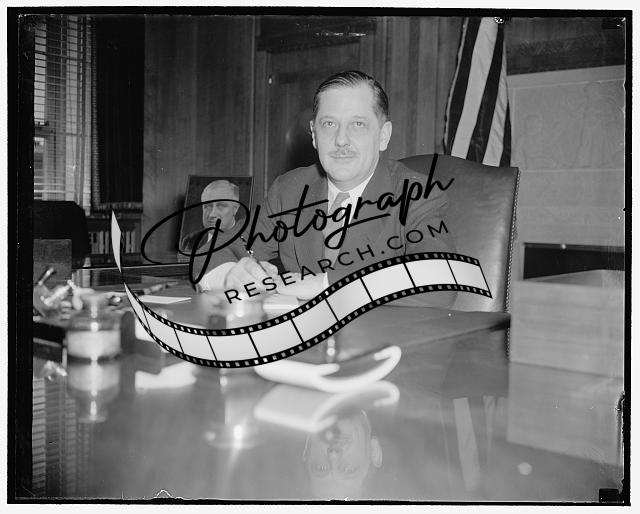 Title: Jackson successor takes oath. Washington, D.C., March 21. Thurman Arnold, former Yale University Law Professor, was today sworn in as Assistant Attorney General in charge of anti-trust division. He succeeds Robert H. Jackson, who was appointed Solicitor General. In the photograph, left to right: Solicitor General Robert H. Jackson, Thurman Arnold, and Ugo Carusi, Executive Assistant of the Attorney General administering the oath, 3/21/38