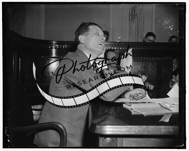 Title: 'Office politics' suggested as official is unable to account for presence of employee. Washington, D.C., March 30. The old cry of 'Office politics' was raised today as the subject of a Senatorial Investigation. Miss Bertha Longergan, Miss Margaret Stanley and Howard P. Locke are pictured at the hearing as pricipal witnesses. Miss Longergan, who described herslf as 'one of the older war horses' in her section, having served there for 18 years, and had worried herself into an appendictomy due to what she charged 'juggling' of her efficiency rating which was given as fair, while Miss Stanley's had been 'good' and 'excellent'. Miss Stanley does not have a civil service Rating, and it was brought out that she is doing work which is suposed to be done by stenographers with civil service ratings. Mr. Locke was unable to account for this fact, and denied that he had told Miss Lonergan that something might be done about her rating if she would not testify at the hearings. Mr. Locke is a Justice Department Attorney and says he also attends to 'certain personnel matters'. 3-30-39