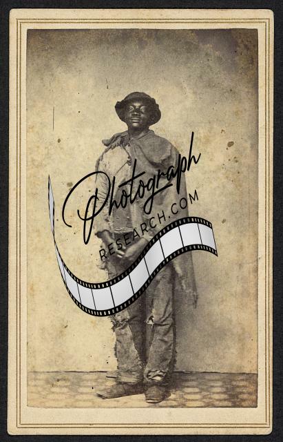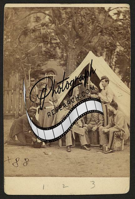 Summary: Photograph shows three soldiers, identified as officers of Company G, Rhode Island Volunteers, and three African American boys outside a military camp tent.