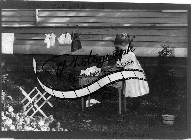 Little girl playing,doing laundry,clothes line,tub,games,adult activities,c1902